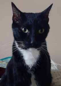 Louie,one of my cats sits on the bed and his furry facial expression represents my feelings as well.
