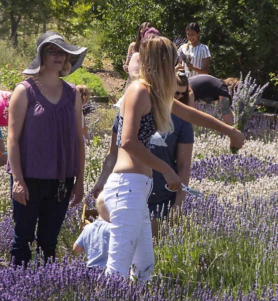 But there is more! It is indeed a festival. Plenty of tables and chairs line the fields where people can sit and relax under the umbrellas and watch all the butts of the crowds amidst the lavender as they bend down to snip the flowers. There are probably more than a dozen booths in the shade under the trees where people sell everything from lavender bread, lavender cookies, to jewelry, hats, photographs, and artwork of all kinds.